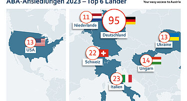 Die ABA-Abteilung INVEST in AUSTRIA hat im abgelaufenen Jahr 1.354 Anfragen internationaler Unternehmen beantwortet, Daraus konnten 496 laufende Ansiedlungs- und Expansionsprojekte betreut werden. Durch die 325 erfolgten Betriebsansiedelungen und -expansionen durch INVEST in AUSTRIA und den Regionalgesellschaften sollen insgesamt 2.419 Arbeitsplätze entstehen. 68 aller realisierten Unternehmensansiedlungen und -erweiterungen kamen aus dem Bereich IKT, gefolgt von wirtschaftsnahen Dienstleistungen (52) und Großhandel (41).