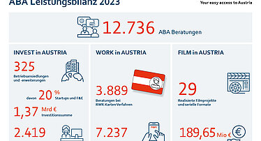 Die österreichische Standortagentur Austrian Business Agency (ABA) macht Österreich als Tochtergesellschaft des Bundesministeriums für Arbeit und Wirtschaft (BMAW) bei internationalen Unternehmen, Spitzenkräften und Filmproduzent:innen attraktiv. Mit ihren drei Geschäftsbereichen INVEST in AUSTRIA, WORK in AUSTRIA und FILM in AUSTRIA berät und unterstützt die ABA kostenlos internationale Unternehmen, Spitzenkräfte und Filmproduktionen bei allen Fragen rund um den Wirtschafts-, Forschungs- und Arbeitsstandort sowie Österreich als Drehort >> We simply make it easy.
